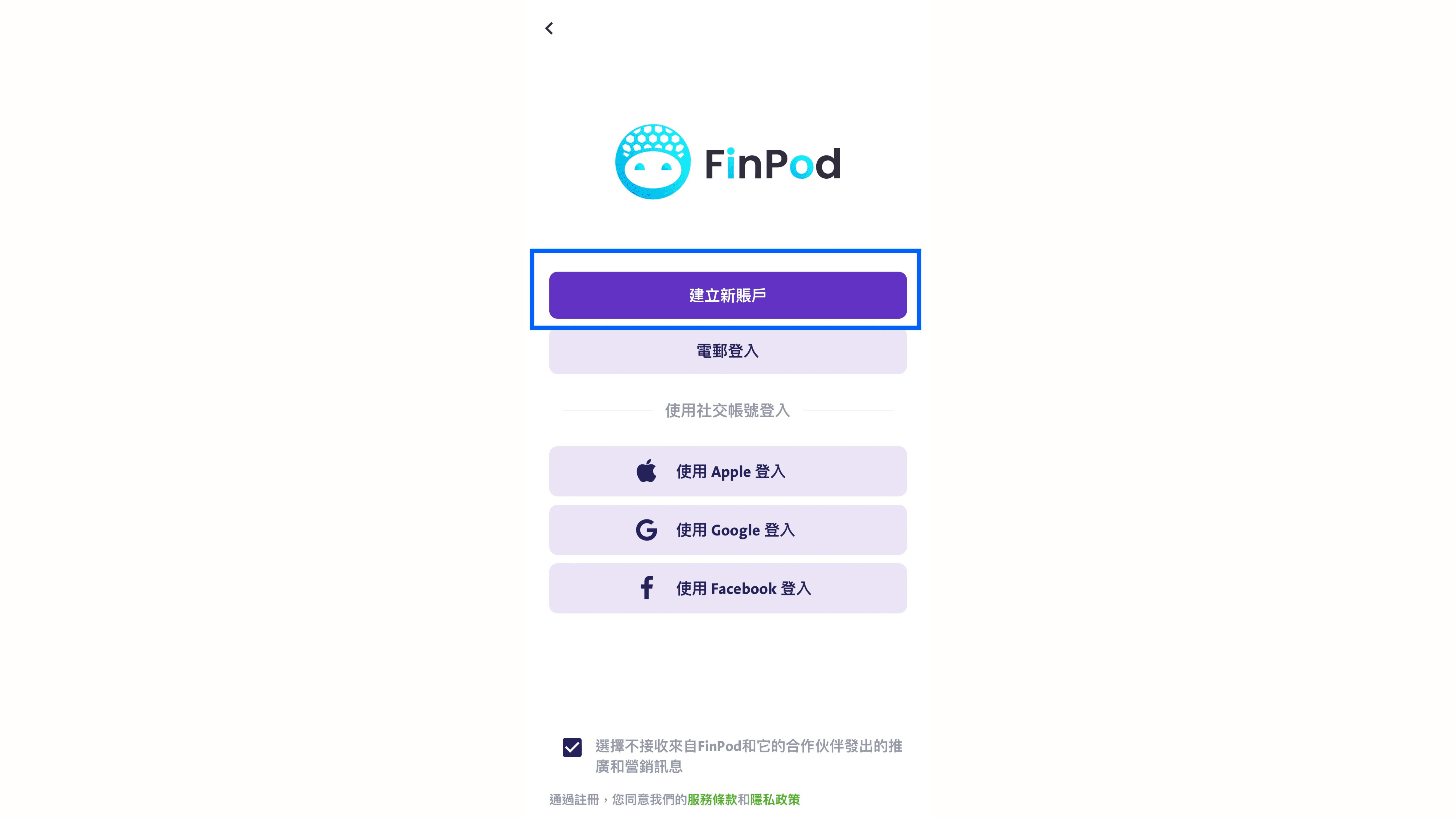 開啟應用程式,選擇建立新賬戶(亦可以選擇使用社交媒體帳號直接登入)