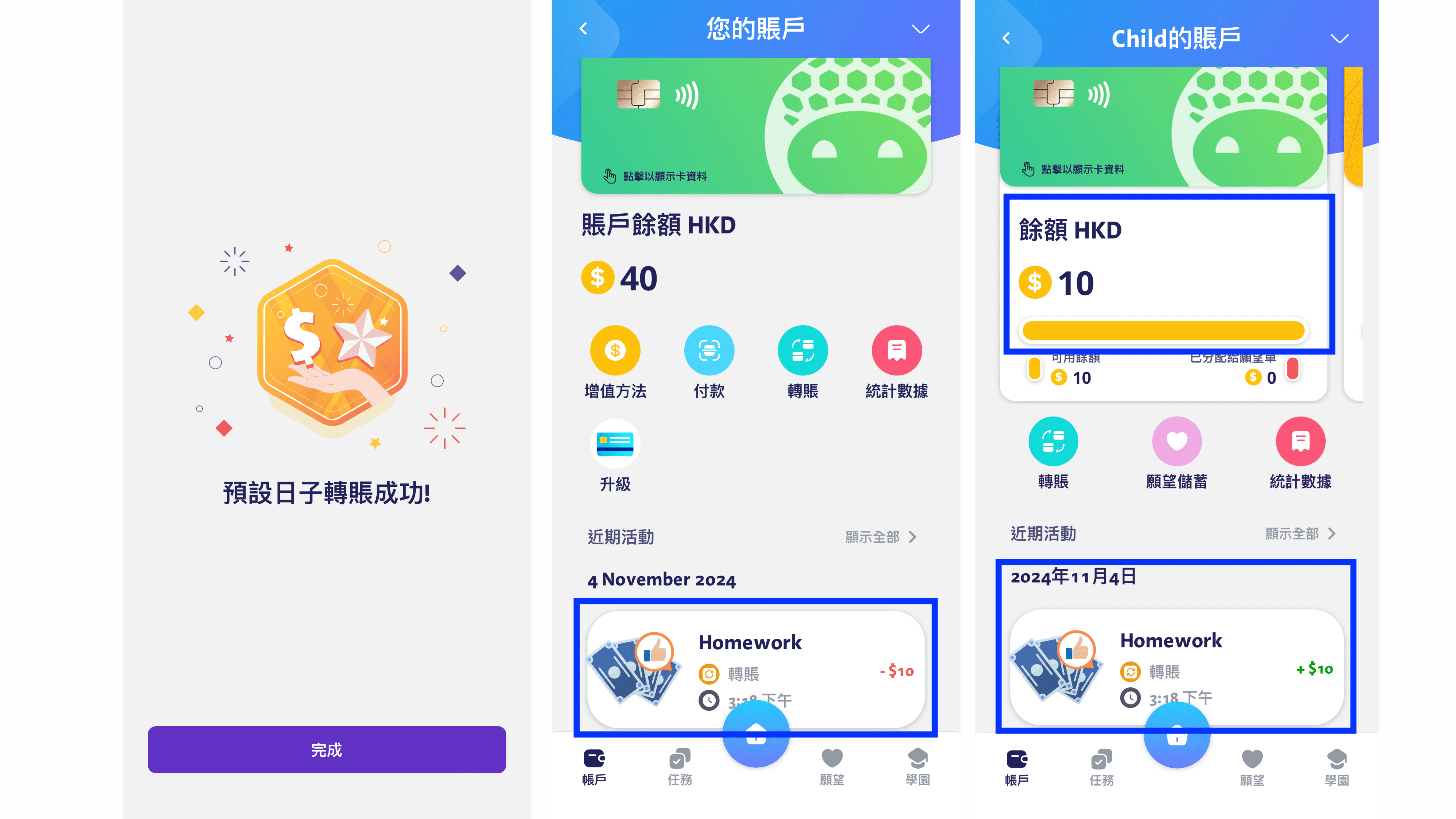 轉賬已成功,你可以讓你的孩子親手管理自己的資金,學習存錢和計劃開支!