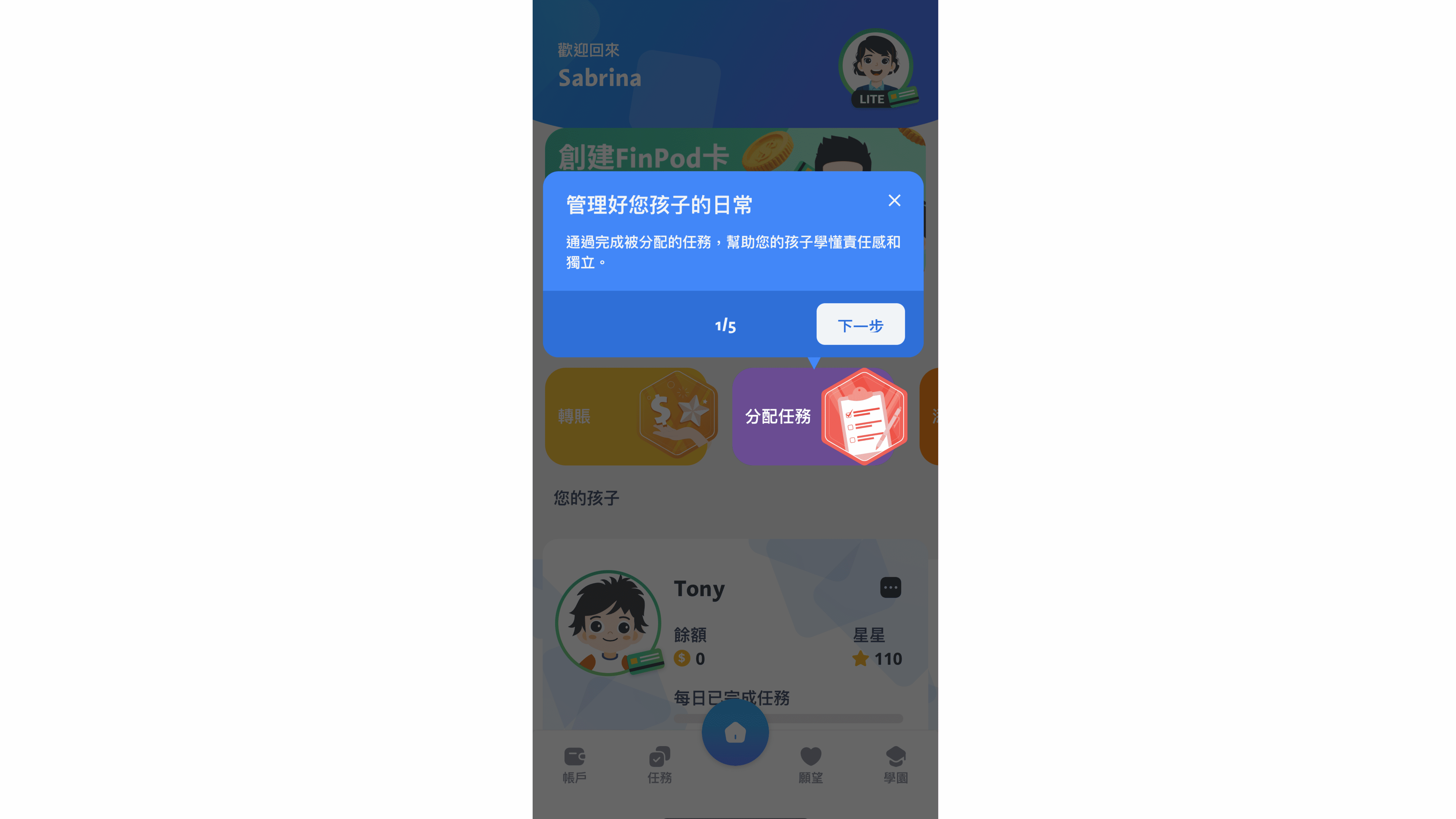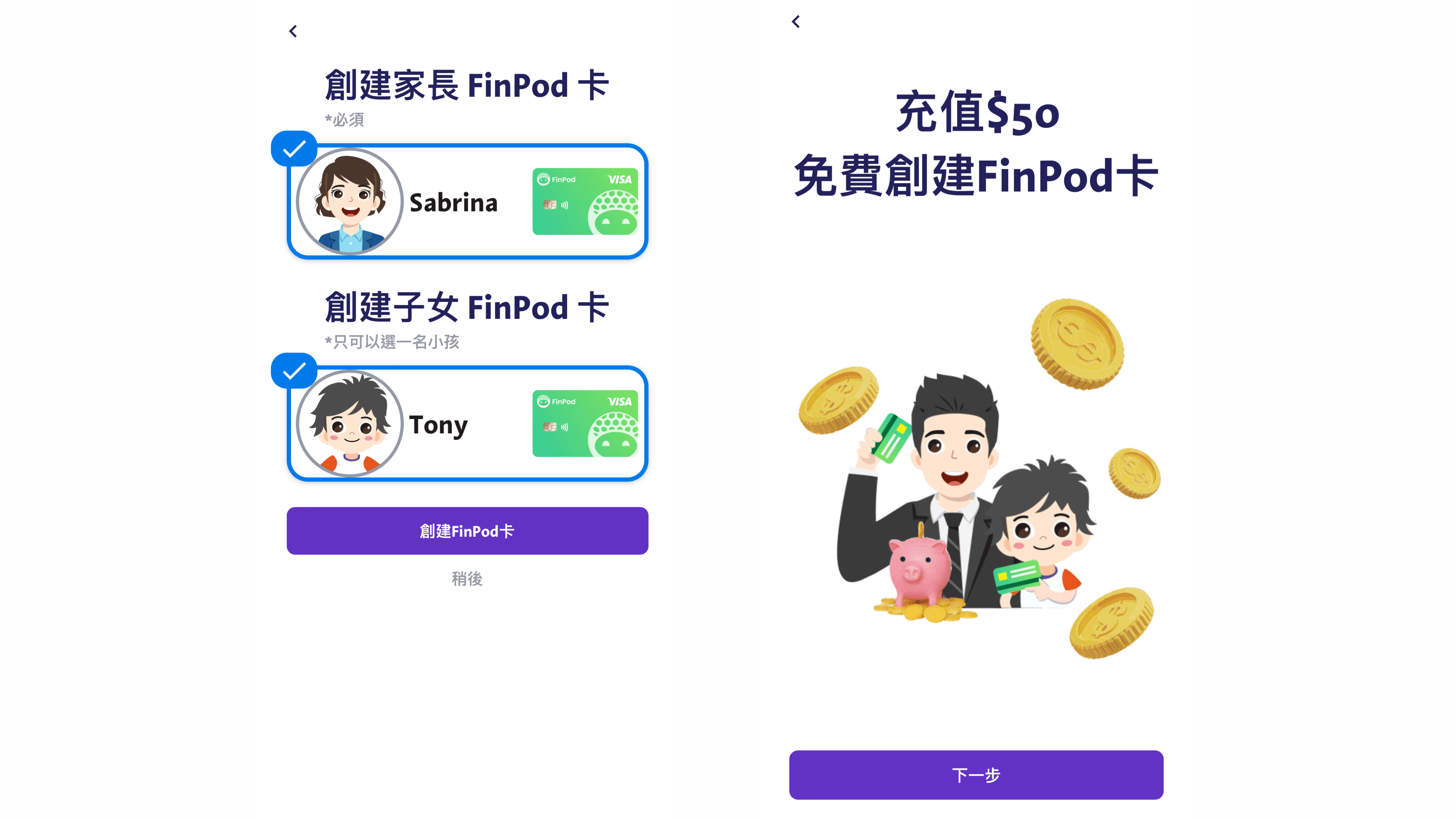 立即下載FinPod App,數分鐘內即可建立賬戶。輕鬆融合日常生活大小事務同理財教育,家長可以陪同小孩在生活場景中學習儲蓄,如何賺取金錢及消費!