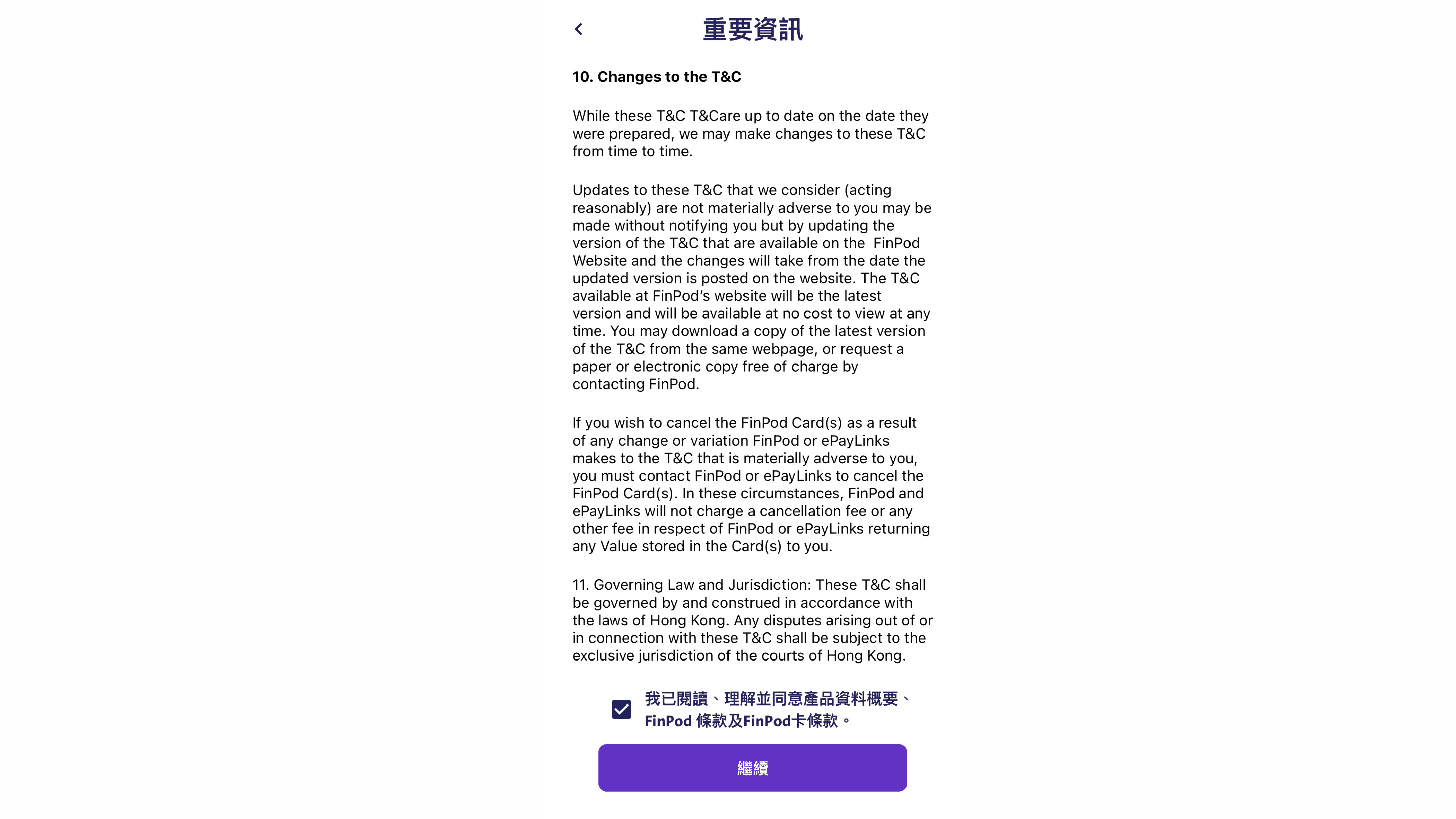 閱讀及確認 FinPod 卡理解產品資料概要、條款及細則。
