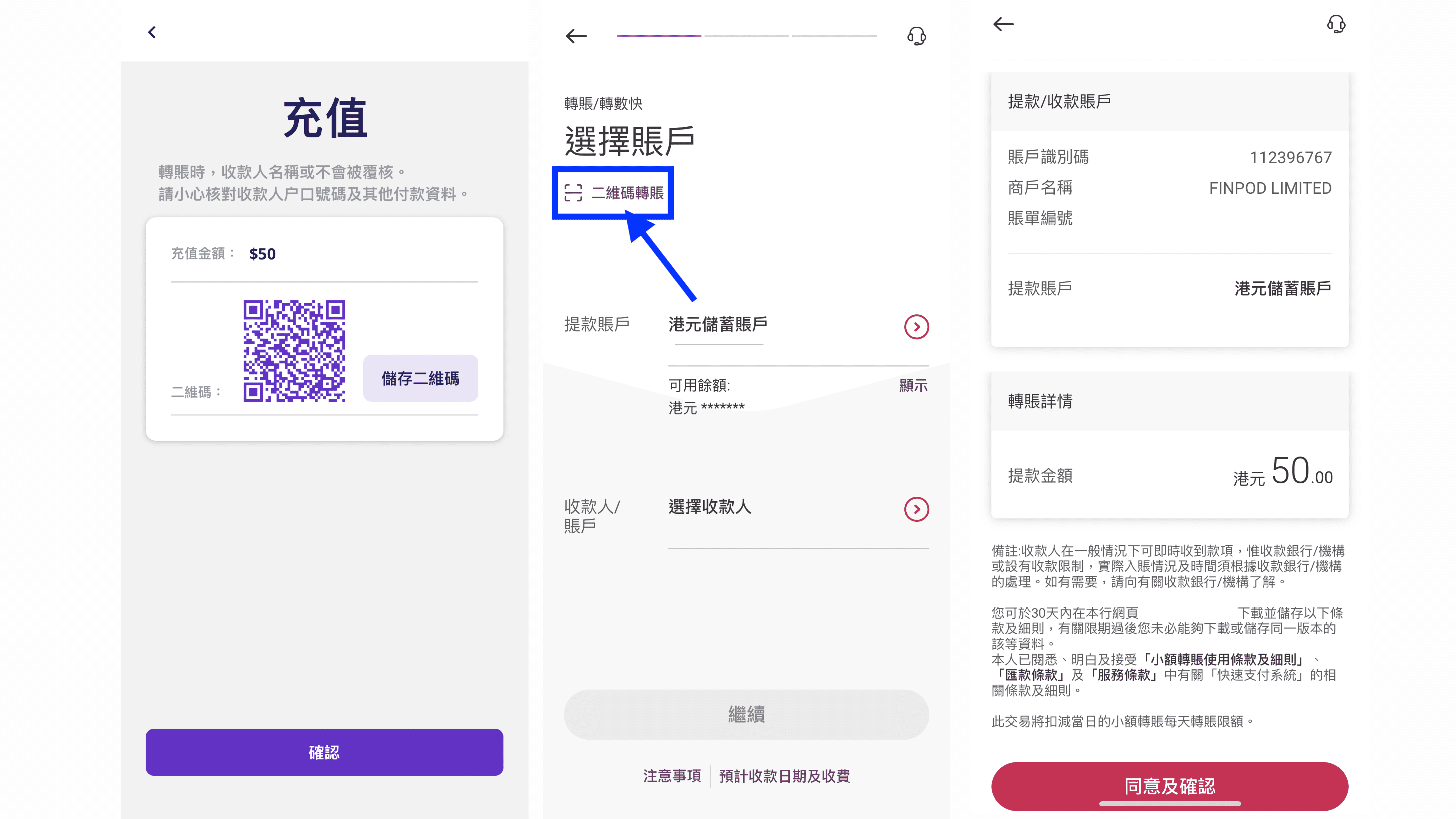 你需要先充值 $50 以啟動FinPod卡,請先儲存二維碼(QR Code)至手機,然後到你的預設銀行按二維碼轉賬即可以轉數快(FPS)轉賬啟動 FinPod Card,完成轉賬後可回到 FinPod App 按確認。