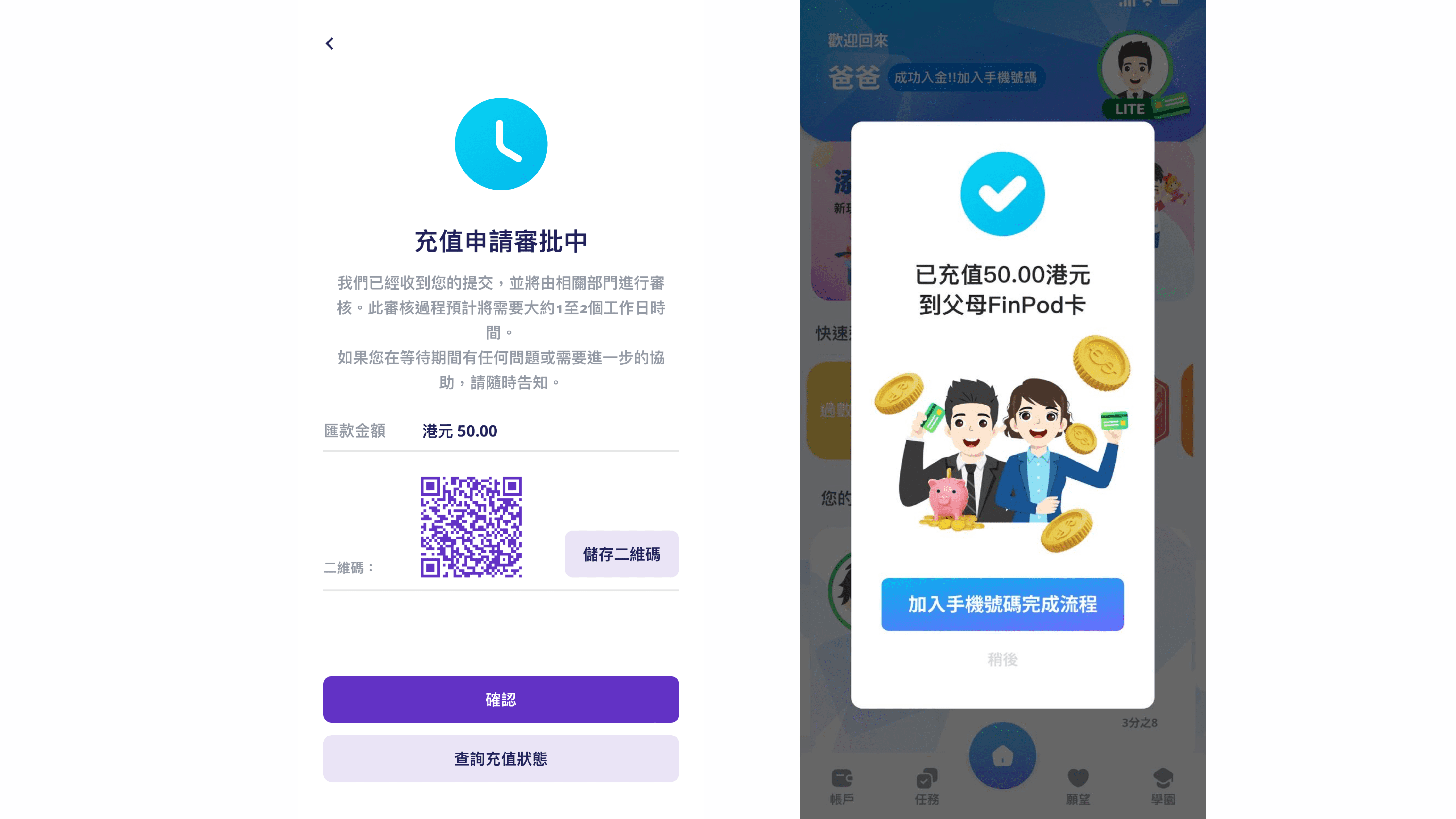 當透過轉數快增值$50 到父母的戶口後系統將會自動繼續並通知你已充值成功。