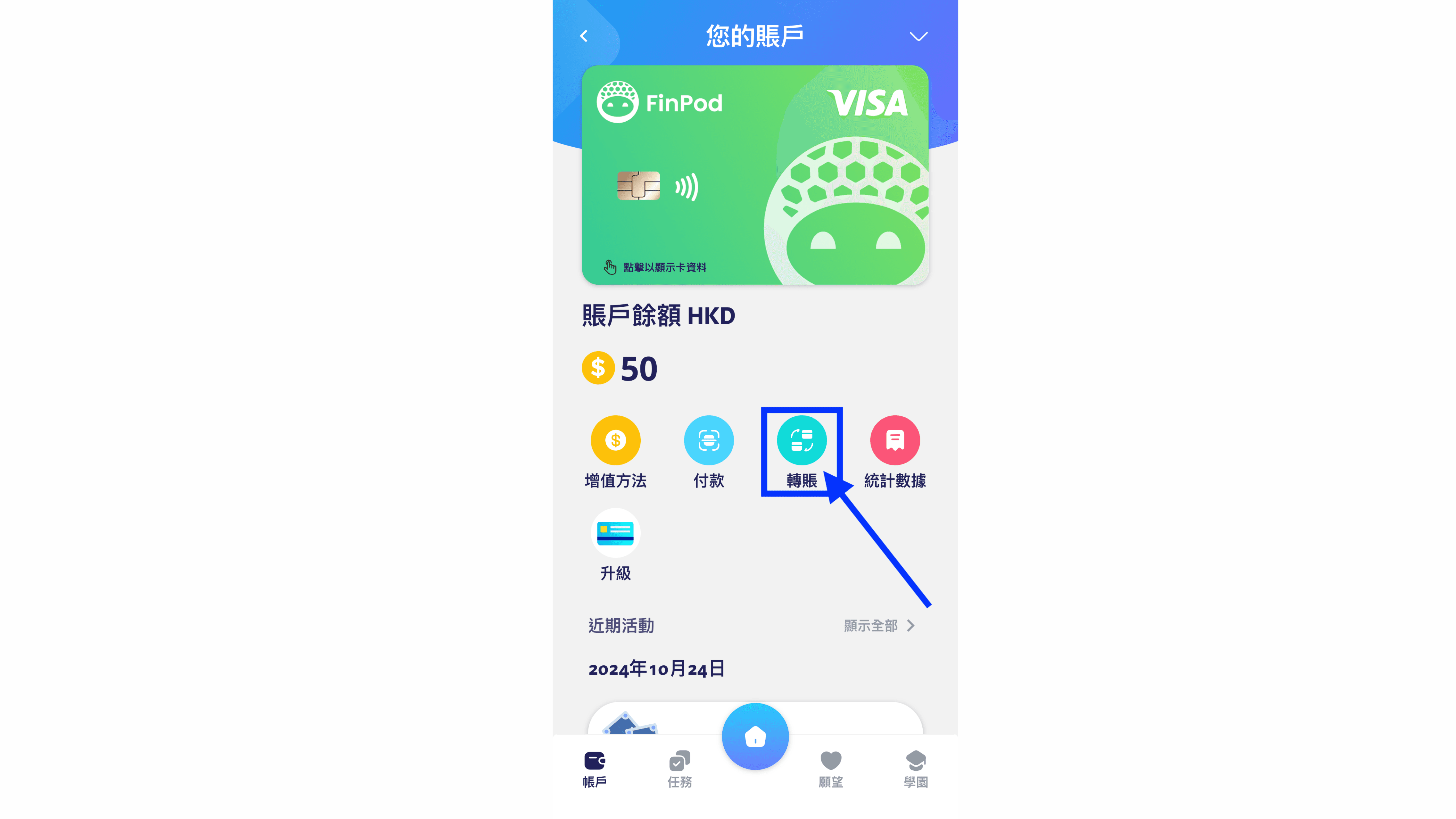 審批完成後,你的FinPod 帳戶已經啟動,並已經充值$50。現在我們可以嘗試轉賬給自己的小孩~請先按一下【轉賬】。